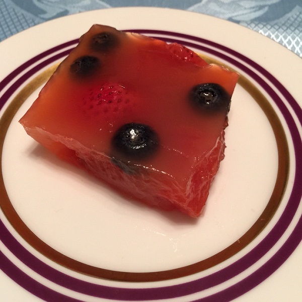 Combine water and apple juice in a cooking pot. Reduce the flame when it starts boiling. Add agar-agar slowly and stir it in until dissolved. Add lemon zest, brown rice syrup and continue cooking for 3 minutes. Add watermelon, strawberries and blueberries. Increase the flame to keep it hot. Simmer for 4-5 minutes. Put in a cool place to cool off. Pour to the dessert bowl(s). When it is cool enough to place it in the refrigerator. When it is jellied, it is ready to be served and enjoyed!